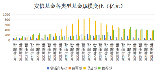 自2022年突破1300亿元以来,安信基金管理规模便持续下降,截至2025年二季度末,全部基金资产净值合计940.34亿元,较高峰期下降了3成左右,混合基金、货币基金规模降幅最大。债券基金规模在增长三年之后,近一年也出现了下滑趋势。