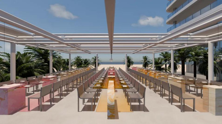 由石材与半透明玻璃拼接的长桌,在露台上被拉至近二十米长,宛若一道从建筑延伸向大海的光带。光源并非传统灯具,而是来自光纤嵌入材质后的“内部发光”。多重材质的折射、逐层堆叠的光晕、风吹过玻璃时产生的微光颤动,全都构成了一个无需语言却高度叙事的场面。