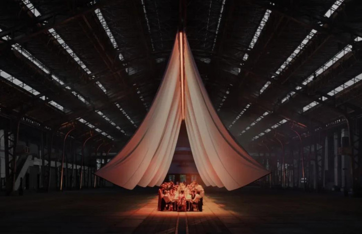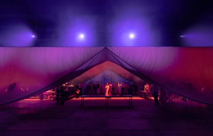 来自布鲁塞尔的跨领域设计团队 Erased Studio 就体现了这种转向。他们曾于比利时根特一座工业仓库完成的 Wedding Show,表面上是一场仪式布景,实际却是利用织物、绳索、灯光与可移动桌椅来编排关系的“空间剧场”。入口处的悬挂布帘并不是装饰,而是随着表演者的牵引不断变化体量: