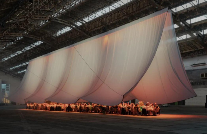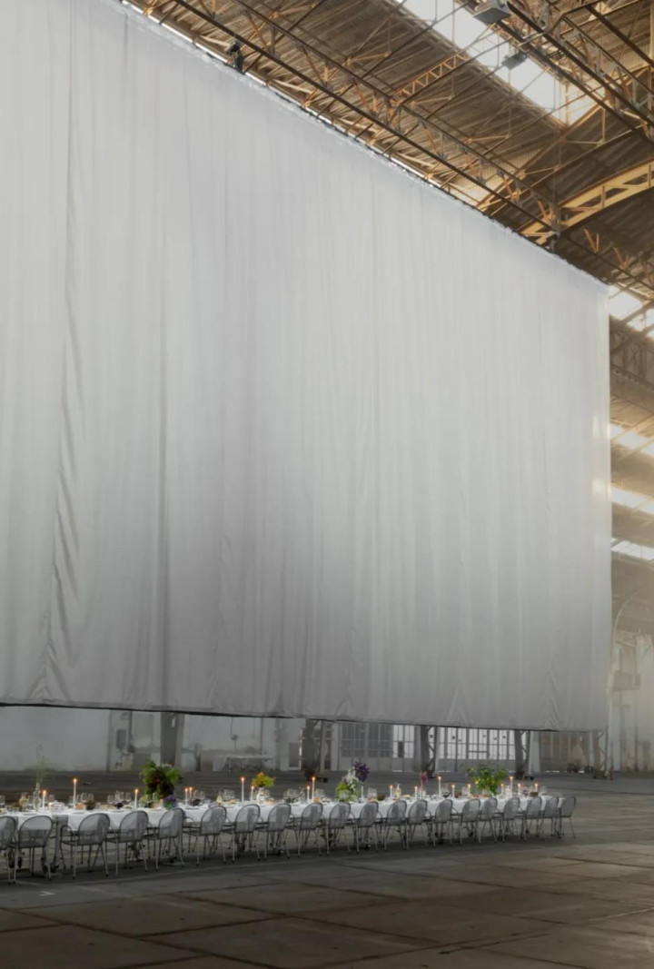 先是从高敞的厂房屋顶被“拉低”,把公共空间折叠为亲密空间;接着桌子被拆分、让出舞池;最终织物覆盖地面,使现场转为介于洞穴与舞台之间的共享体。