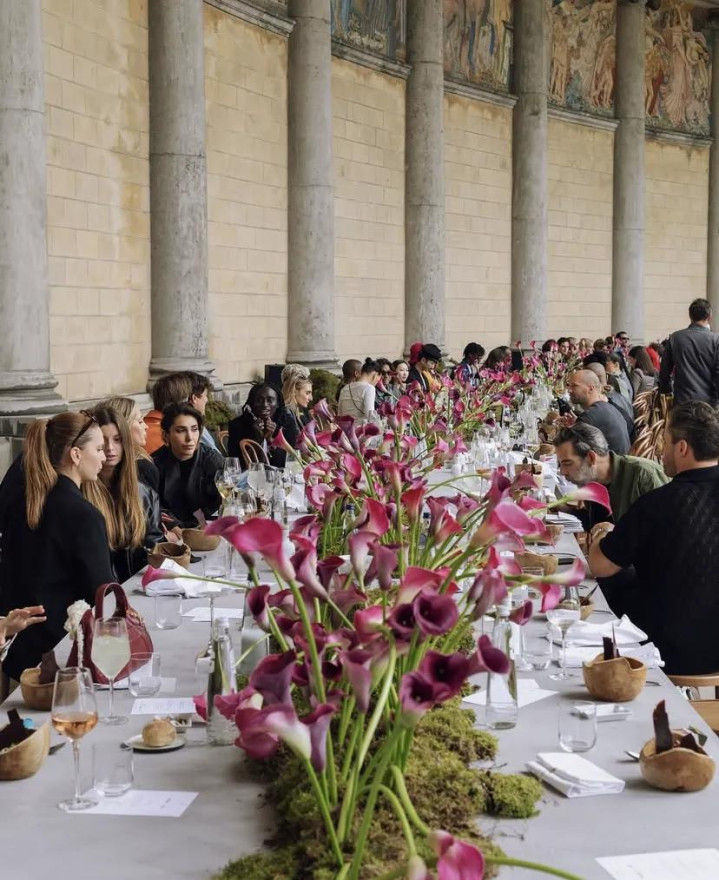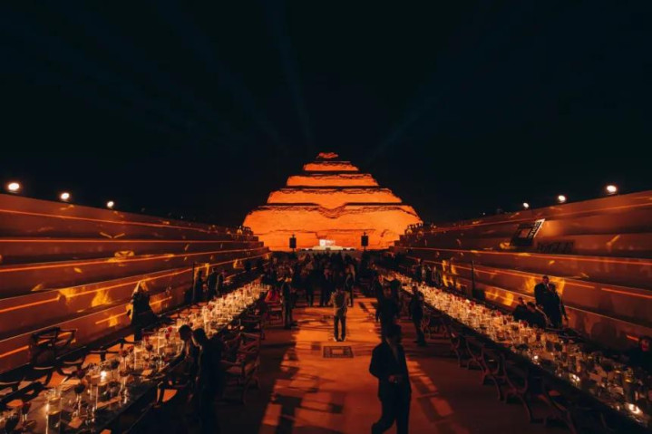 Vogue Arabia 与 Qatari Diar 于11 月在萨卡拉的台地之上呈现了一夜文化对话:设计团队WE ARE ONA用极简的结构和镜面体块响应千年遗址的几何秩序,光影被刻意安排以呼应金字塔的阶梯线条,宴席排列成为一条轴线,让宾客以“文明横切面”的身份被安置在现场。参加者不是来消费一场用餐秀,而是在一个被古老结构“阅读”的情境里完成一次集体的观看与互为见证。