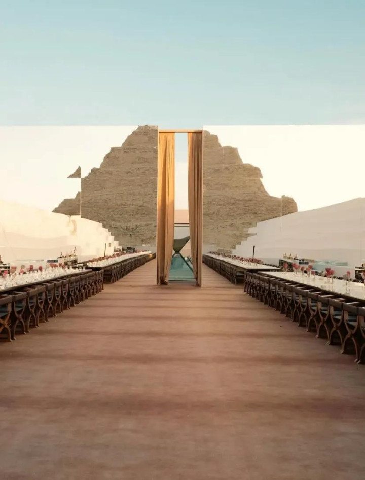 与城市历史建筑的“半户外”实践相比,2025 年在埃及萨卡拉(Saqqara)举办的Vogue盛典则将“场域为叙事”推到一个近乎仪式化的高度。