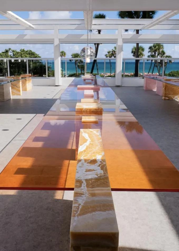刚刚结束的 2025 Design Miami 上,最先在社交媒体上刷屏的,不是某件备受追捧的限量家具,而是一组在海边露台上拼接出的超长餐桌阵列,光从实体内部渗出、材质在风中闪烁,整个场景几乎像一场正在发生的海岸幻觉。